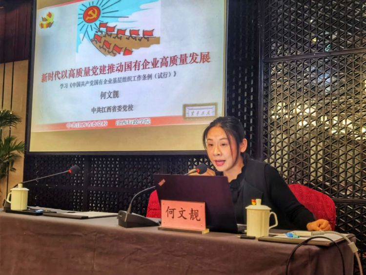 在講課中,中共江西省委黨校何文靚副教授以“筑牢中國長治久安的根基——十九屆四中全會精神解讀”和“新時代以高質(zhì)量黨建引領(lǐng)國有企業(yè)高質(zhì)量發(fā)展”為題,從四個方面與學員們進行了學習交流:一是提高站位,深刻認識十九屆四中全會的重大意義;二是深刻領(lǐng)會,準確把握十九屆四中全會關(guān)于國資國企改革的新動向;三是真抓實干,全面推進國企治理體系和治理能力現(xiàn)代化;四是化危為機,努力完成全年各項既定任務(wù)目標。
