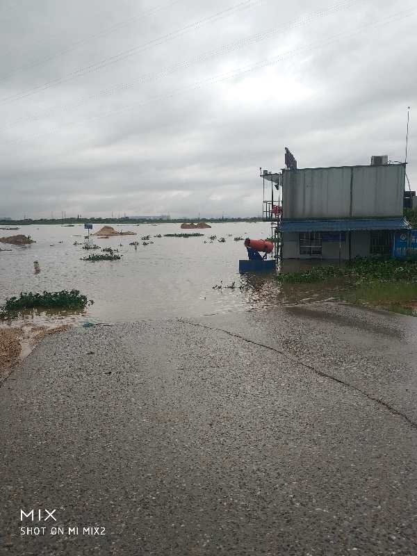 連日的暴雨,致使砂場場地大部分存在積水,公司經開國集砂場利用砂堆作為圍堰,有效的防止水灌入場地;對于場地內澇情況,待雨勢稍弱時,設置抽水機將場內積水及時排出。