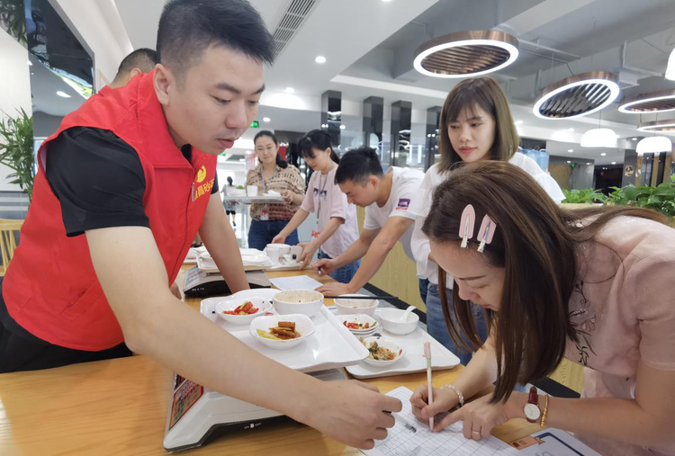 9月7日中午12:00,在公司食堂,各式菜品琳瑯滿目,員工排隊(duì)拿菜秩序井然。公司的黨員志愿者們?cè)谑程眠M(jìn)行引導(dǎo),員工將用餐后的餐盤(pán)放置餐具回收處進(jìn)行稱重,并進(jìn)行登記,大家都非常配合。