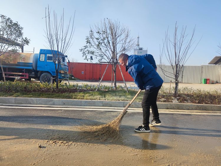 一大早,經開片區(qū)砂場經理助理李小玉就組織班組人員進行道路除冰工作。一聲令下:所有人員都有條不紊地拿好工具,奔向自己負責的區(qū)域,破冰開路。
