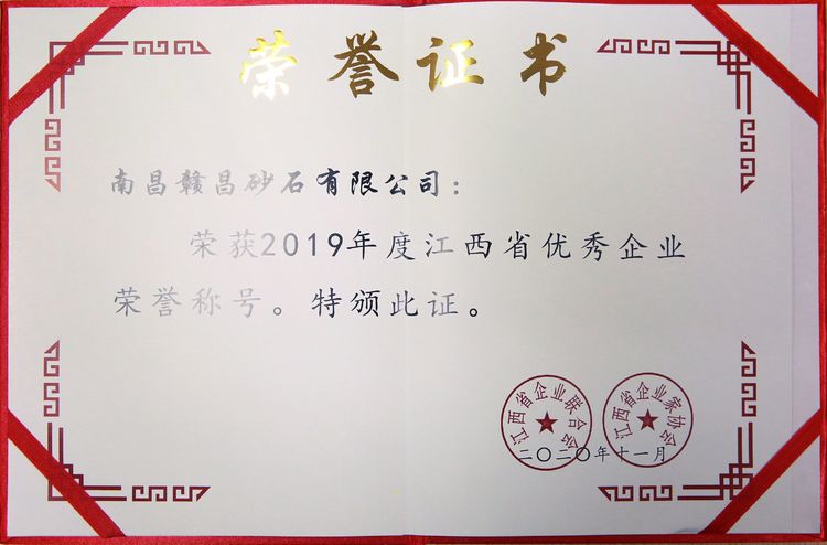 贛昌砂石公司榮獲“2019年度江西省優(yōu)秀企業(yè)”,公司總經(jīng)理陳鴻榮獲“2019年度江西省優(yōu)秀企業(yè)家”,副總經(jīng)理張軍茂榮獲“2019年度江西省優(yōu)秀廠長(經(jīng)理)”榮譽稱號。