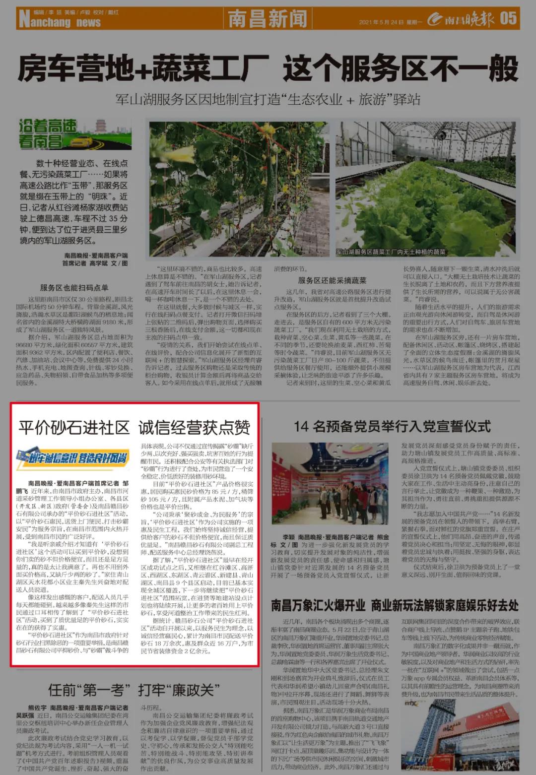 近年來,由南昌市政府主辦,南昌市河道采砂管理工作領(lǐng)導(dǎo)小組辦公室、各縣區(qū)(開發(fā)區(qū)、新區(qū))政府(管委會(huì))及南昌贛昌砂石有限公司承辦的“平價(jià)砂石進(jìn)社區(qū)”活動(dòng),以“平價(jià)砂石惠民,送貨上門便民、打擊砂霸安民”為服務(wù)宗旨,在南昌市范圍內(nèi)火熱開展,受到南昌市民的廣泛好評(píng)。?