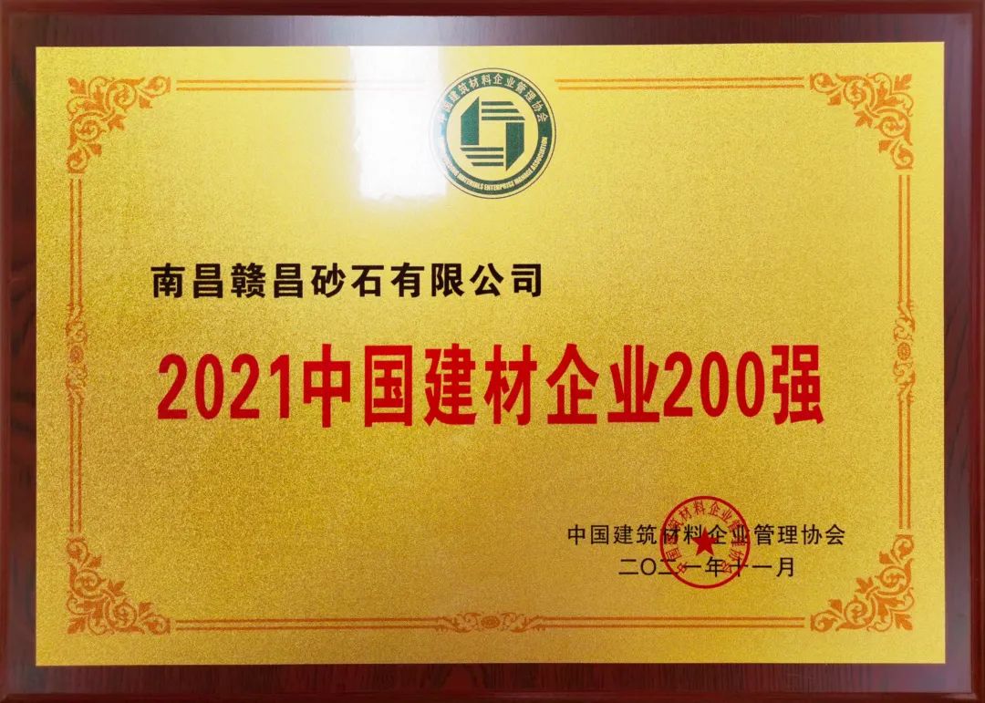 中國建筑材料企業(yè)管理協(xié)會、中國建筑材料企業(yè)管理協(xié)會品牌建設分會共同在大會上為2021中國建材企業(yè)500強頒發(fā)證書。南昌贛昌砂石有限公司作為500強企業(yè)前200名,特榮獲“2021中國建材企業(yè)200強”榮譽稱號。