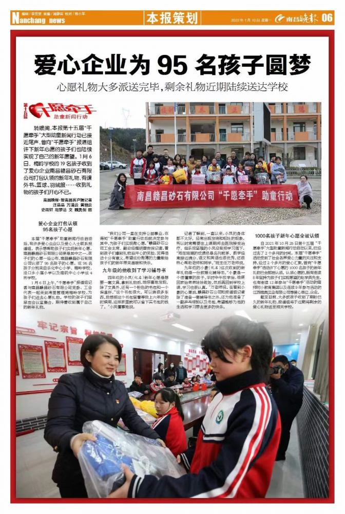 轉(zhuǎn)眼間,本報(bào)第十五屆“千愿牽手”大型助童新聞行動(dòng)已接近尾聲,曾向“千愿牽手”報(bào)道組許下新年心愿的孩子們也陸續(xù)實(shí)現(xiàn)了自己的新年愿望。1月6日,梅嶺學(xué)校的19名孩子收到了愛心企業(yè)南昌贛昌砂石有限公司打包認(rèn)領(lǐng)的新年禮物,有課外書、籃球、羽絨服……收到禮物的孩子們開心不已。
