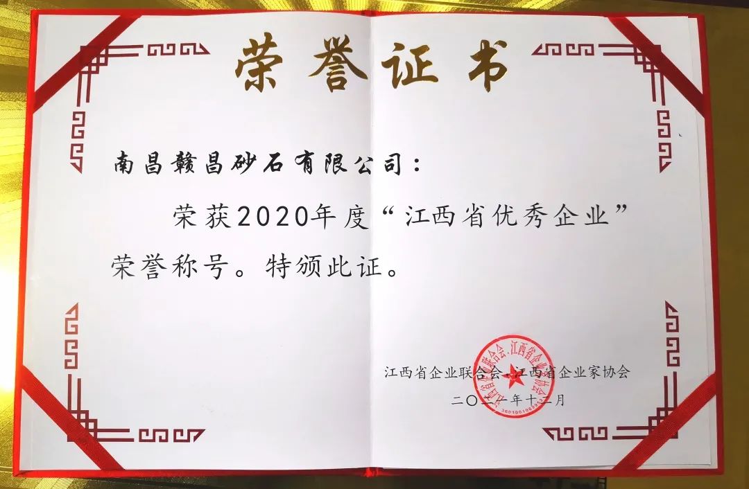 2021年贛昌砂石公司榮獲江西省企業(yè)聯(lián)合會(huì)、江西省企業(yè)家協(xié)會(huì)頒發(fā)的“2020年度江西省優(yōu)秀企業(yè)”榮譽(yù)稱號(hào)。