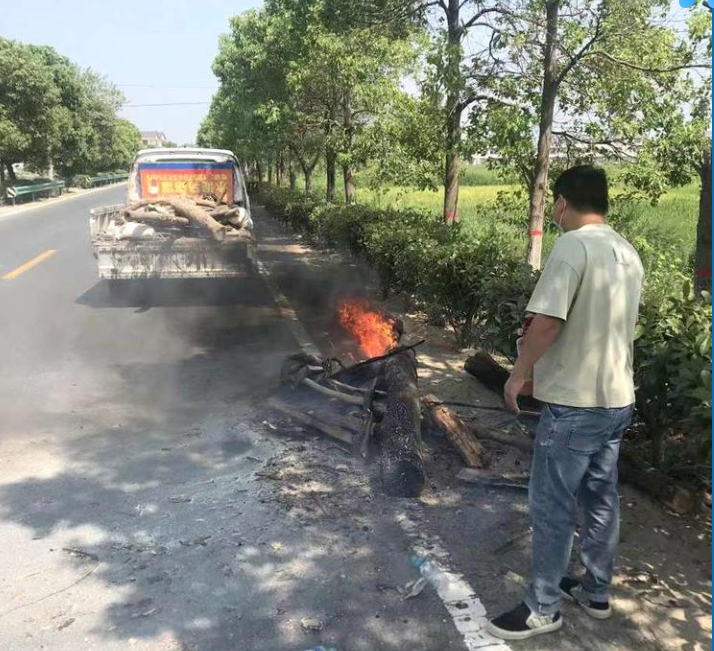 來(lái)到車前,發(fā)現(xiàn)貨車司機(jī)正在用瓶裝礦泉水澆在冒有濃煙的木柴、木屑上面進(jìn)行滅火,但濃煙越來(lái)越大,情況十分危急,胡建洋立刻去車上拿隨車干粉滅火器和水,張江南聯(lián)合司機(jī)把冒有濃煙的木柴、木屑卸到路邊上,這些木柴、木屑被扔下來(lái)沒多久,明火迅速燃燒了起來(lái)。張江南使用滅火器和水對(duì)火勢(shì)進(jìn)行壓制,經(jīng)過(guò)十分鐘的撲救,明火被完全撲滅。