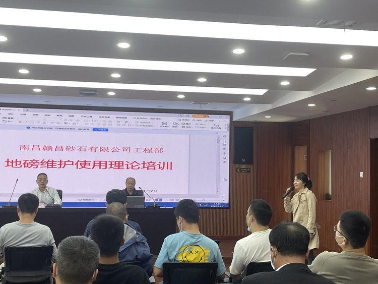 2022年11月7日下午,贛昌砂石公司工程部組織各片區(qū)、各分公司等生產(chǎn)一線部門共計50名員工在公司22樓會議室開展地磅維護(hù)使用理論培訓(xùn)。培訓(xùn)由工程部負(fù)責(zé)人黃露主持,公司總經(jīng)理助理葉劍飛參加開班儀式。