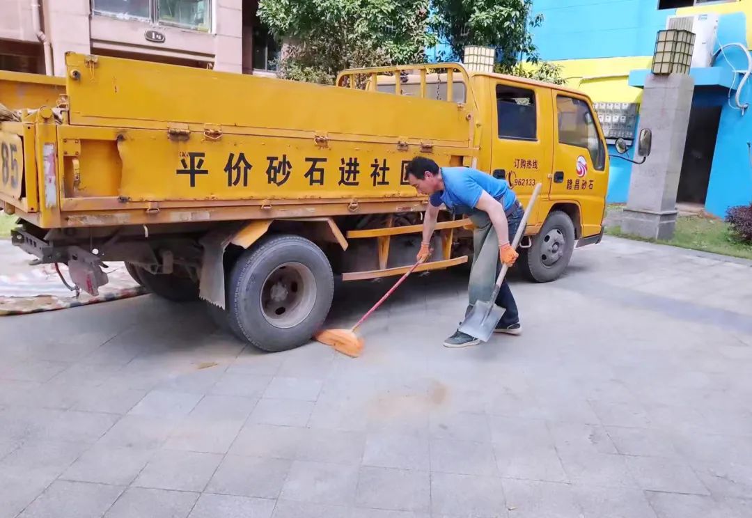 配送入戶過程中,配送車輛根據(jù)客戶要求到達指定地點后,卸貨前,首先用篷布鋪設(shè)在地面上,防止砂石污染地面,待砂石搬運作業(yè)完成后,工人會收拾好篷布,并清掃干凈遺灑在地面的砂石后再離開,確保配送完成后不影響周邊環(huán)境衛(wèi)生。