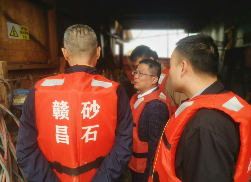 陳鴻一行來到贛撫尾閭項目畫眉咀料場,現(xiàn)場聽取了重點項目部負責人就項目開采、作業(yè)設(shè)備及安全管理等情況的簡要匯報,并對作業(yè)船只安全設(shè)施配備、安全隱患等情況進行了檢查。在檢查的過程中,陳鴻對船只上安全設(shè)施的擺放、安全通道的暢通以及電線的布置都提出了進一步的整改要求。