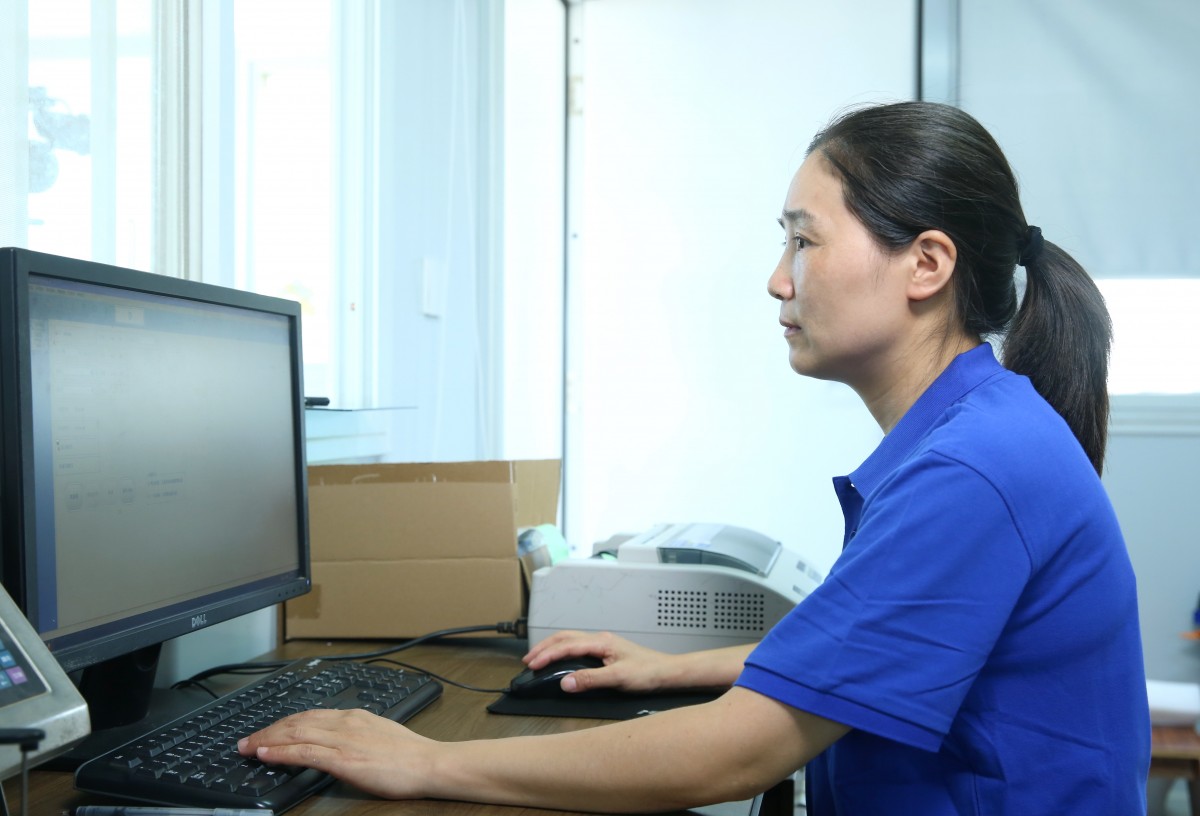 在磅房中,窗口吹進(jìn)的熱浪一陣又一陣,但是發(fā)貨員蔡文娟的臉上也并未出現(xiàn)一絲疲態(tài)的痕跡正在認(rèn)真做著運(yùn)輸車輛出場(chǎng)前的稱重打榜工作。