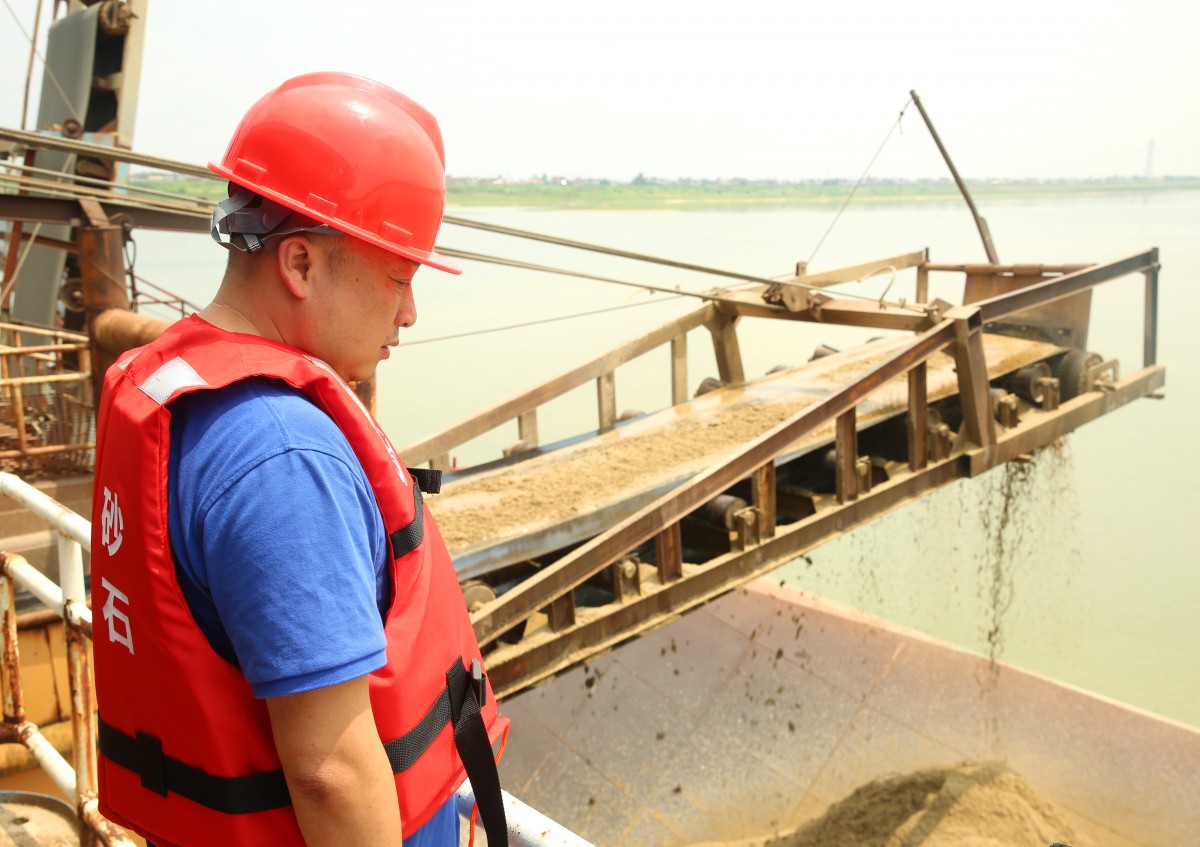 頭頂著烈日,贛昌砂石公司開采管理中心南贛4號采區(qū)班組的工作人員正在對砂石采挖情況進行仔細的檢查。他們時刻關注設備的運行情況。盡管水面蒸騰的熱氣和長時間的暴曬使他們滿臉通紅,汗流浹背,但他們仍然兢兢業(yè)業(yè)地工作。